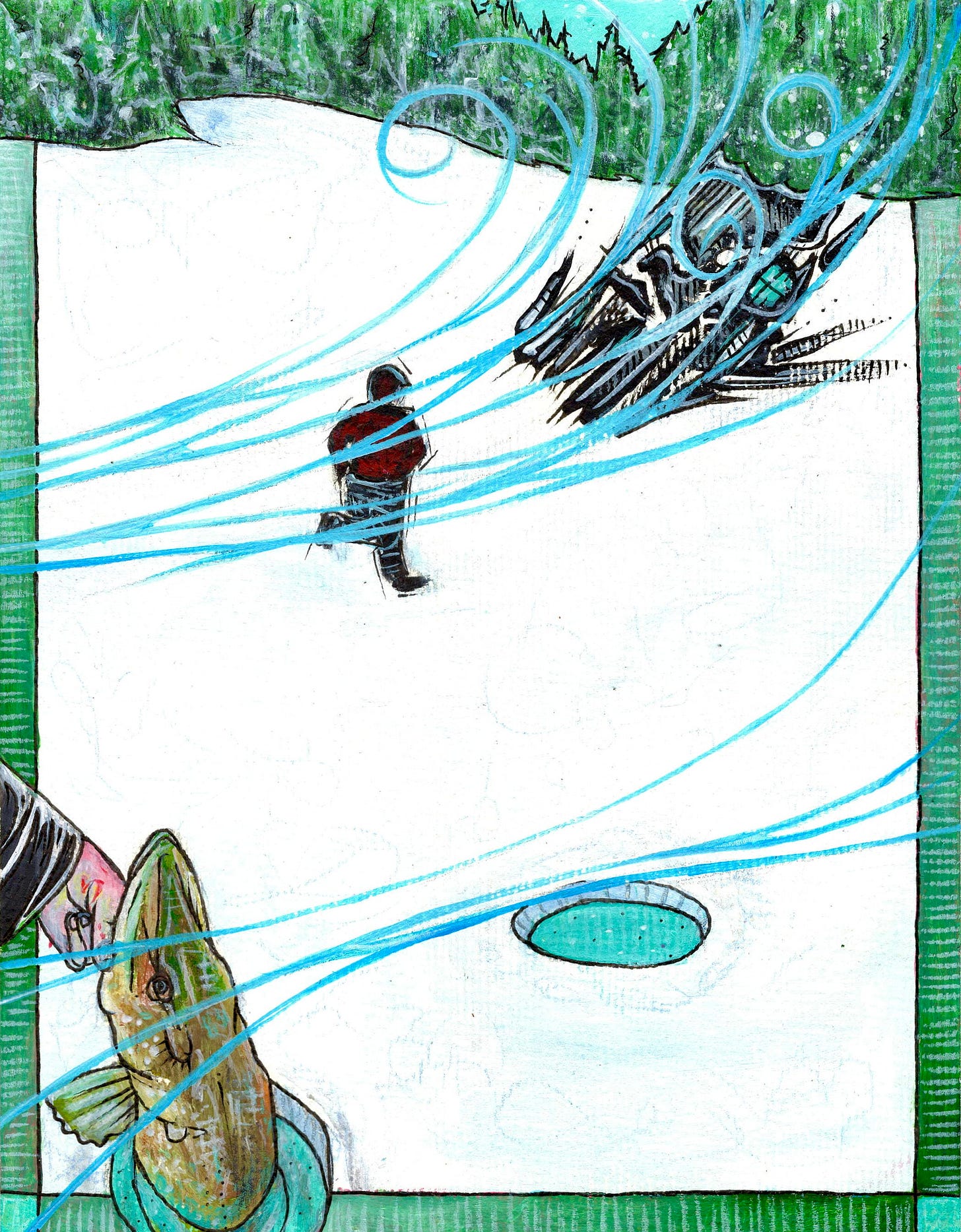 Well, as I was messing with the line, I realized that it wasn’t because they were tangled together. It was because I had caught a big Northern pike that was lodged sideways in the hole, and tangled up with my buddy’s line. And she couldn’t really swim properly, and I guess she got wrapped up, and then when the wind blew, it pulled her up, and she went bam, sideways, up under the hole. So she’s lodged up under there, not moving, just stiff. And I’m trying to pull the other line, and I can’t, and I go down in the other hole and see her - I see her sideways, and I couldn’t make out what it was. The side of a Northern is kind of green, whitish. And I’m like, “What the hell?” And I realize now that the Northern is holding my ice house from blowing away.